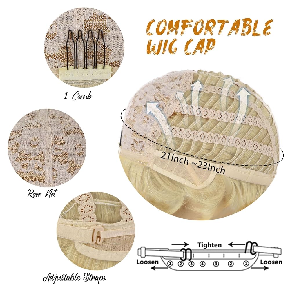 【Adjustable Straps & Breathable Rose Net】This short blonde wig fits for most head sizes and shapes with elasticated breathable rose net and adjustable straps inside. You can loosen or tighten the wig to reach a most comfortable condition.
