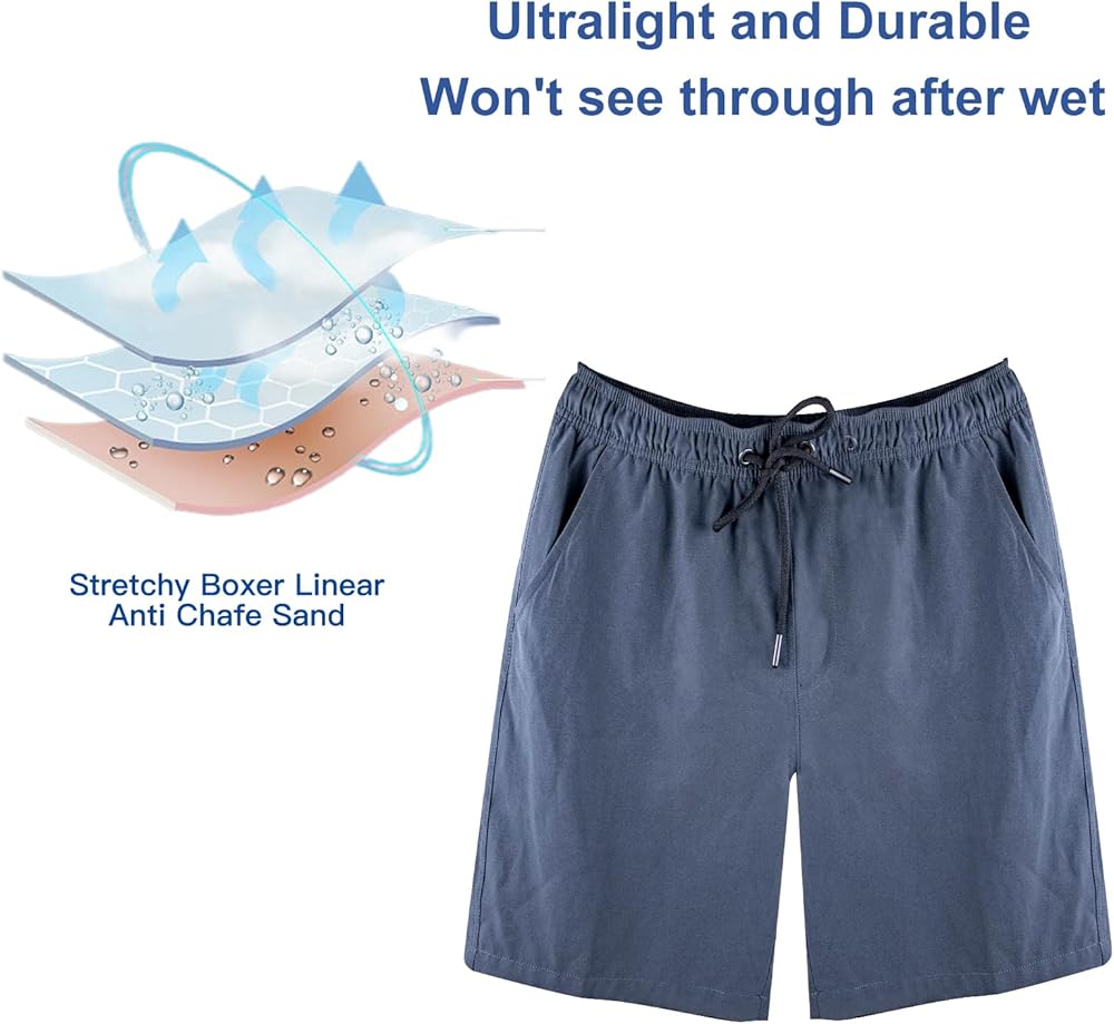 2-in-1 Compression Liner: Mens beach shorts with built-in compression lining, which is soft, skin-friendly, and far superior in feel to the old fishnet mesh liners. No need to wear extra underwear or worry about issues with chafing, keep you comfortable during exercise.