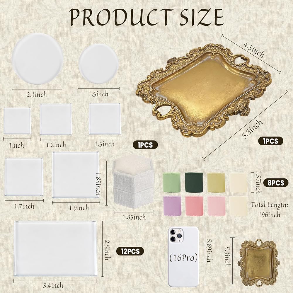 Vintage Gold Jewelry Tray Set - Flat Lay Props Wedding Kit with Velvet Ring Box, Chiffon Silk Ribbon, Small Jewelry Dish for Bridal Party Decoration Gift