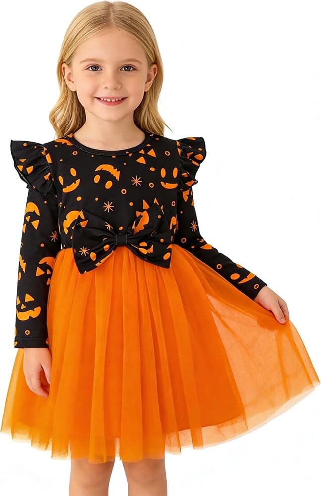 Design: Features a unique print paired with two layers of vibrant tulle skirt, features beautifully ruffled sleeves, and there is a bow decoration at the waist for a festive look.