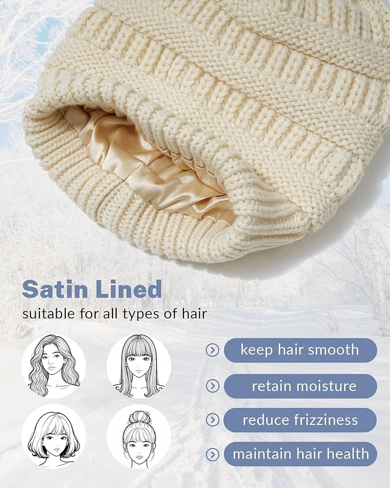 Protective Satin Lining: Knit beanies for women feature a satin lining that shields your hair in dry weather. It helps lock in moisture to prevent breakage and split ends while minimizing static, leaving your hair tangle-free and silky smooth