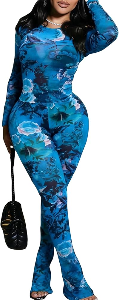 Feature: leopard print, floral print, multicolored, long sleeve, long sleeve crew neck crop top and high waist flare long pants, see-through mesh material, sexy club outfits for women, 2 peice birthday outfits, two piece sets for women going out, fashion cheetah print set, bodycon pants outfits 2 piece set