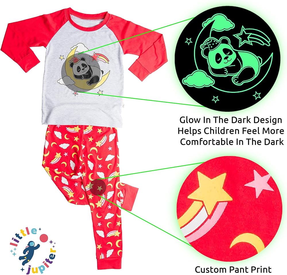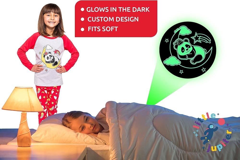 Do you have a little girl? Is she having issues with sleeping in the dark? Make her feel just a little more at ease at night with GLOW IN THE DARK pajamas from Little Jupiter! The outline glows🌟 in the dark after around 10-15 mins of being exposed to light💡Have a UV light? Shine it on the design to SUPERCHARGE the glowing feature for even more brightness! So much fun! So Cute! Our GLOW IN THE DARK Girls Pajamas are both functional and help children with their fear. Does your child love unicorn pajamas🦄? What about kitty cat pajamas🐱? Mermaid pajama lover👧? We've got you covered with the absolute best clothes for your princess daughter, granddaughter or family friend. We tested all of our competitor's pajamas and made ours awesome! 🙌 ✓ 2 Piece set comes with both long sleeve top and bottom ✓Our pajama set features a soft yet stretchy cotton blend material. It washes/dries great in the machine with VERY MINIMAL SHRINKAGE! 👍 ✓Tested cotton blend materials for a great fit ✓Perfect for sleepovers, pajama parties, pj get togethers, unicornio parties, vacations, playdates, birthday gifts, presents, and more! ✓Designed with a custom unicorn pajamas, mermaid pajamas, & cat pajamas 🐱🦄👧 ✓ No neck tag. Say goodbye to itchy necks! ✓ Medium thickness. Wear it year around in most locations ✓ A variety of sizes from age 2 to 10 yrs. Toddlers to big girls will love it ✓ Features contrasting cuffs ✓ Little Jupiter is a US based brand BEST GLOWING EFFECT🌟: Place under light for 10-15 mins. This allows the design to charge and glow brighter. UV lights will SUPER CHARGE the design. BEST CARE😀: Using a drying machine on the top will diminish the glowing effect slightly. Hang dry for best result.
