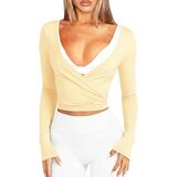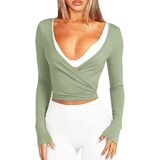 - Features: Wrap style, deep V-neckline, long sleeves, adjustable self-tie straps, slim fit, cropped length