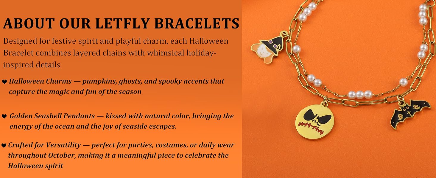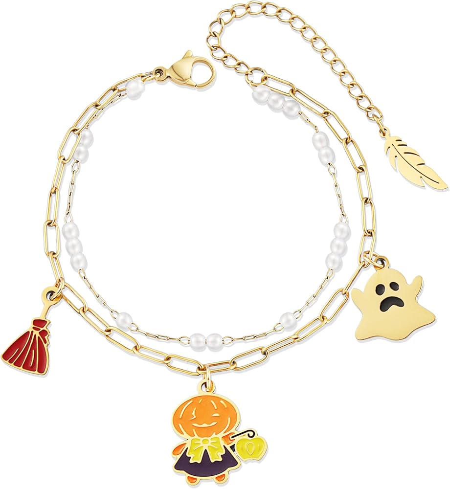 SUPERIOR MATERIALS: Crafted in 18K gold-plated stainless steel and accented with polished beads, this bracelet is hypoallergenic, tarnish-resistant, and comfortable for everyday wear. Finished with Halloween-themed charms, it shines with festive spirit — perfect from haunted nights to trick-or-treat fun