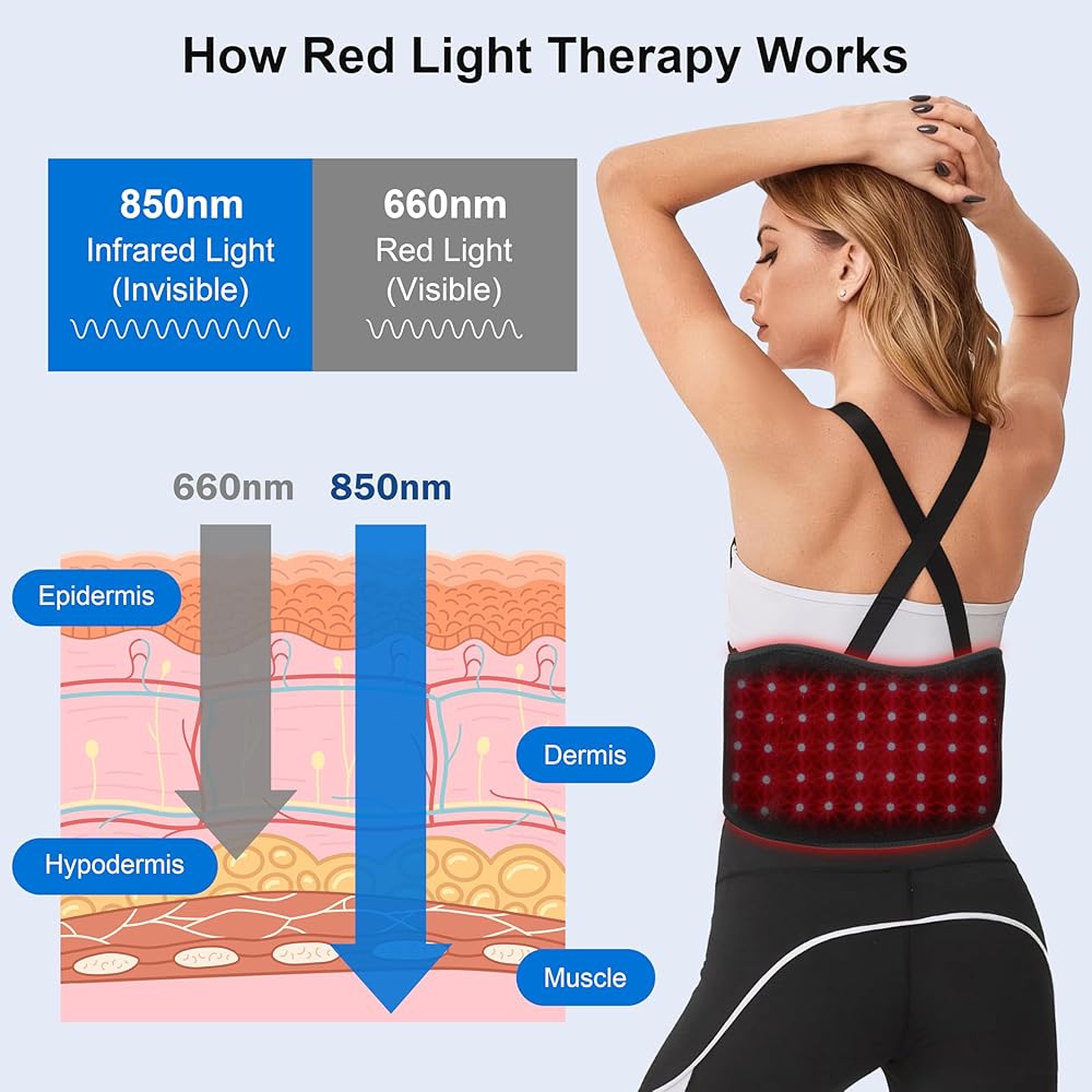Large Size Design: Infrared light therapy belt size is 51*8.3 IN, large area design, easily covering the upper back, lower back, shoulders, buttocks, thighs, legs, arms and other parts. Equipped with a 15-inch adjustable extension belt, suitable for people of different body shapes