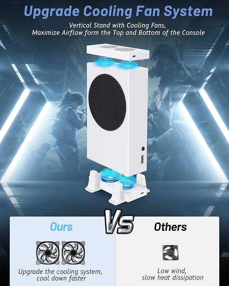 【Fast Cooling System & Low Noise】This Xbox Series S cooling stand has two cooling fans, this Xbox Series S cooler fan can reduce the temperature of the console more quickly and effectively. And there is no loud noise when this Xbox Series S fan cooler runs, even if it is fast speed (Fan volume below 45 dB), this Xbox Series S fan will not make an unbearable noise to disturb you playing the games.