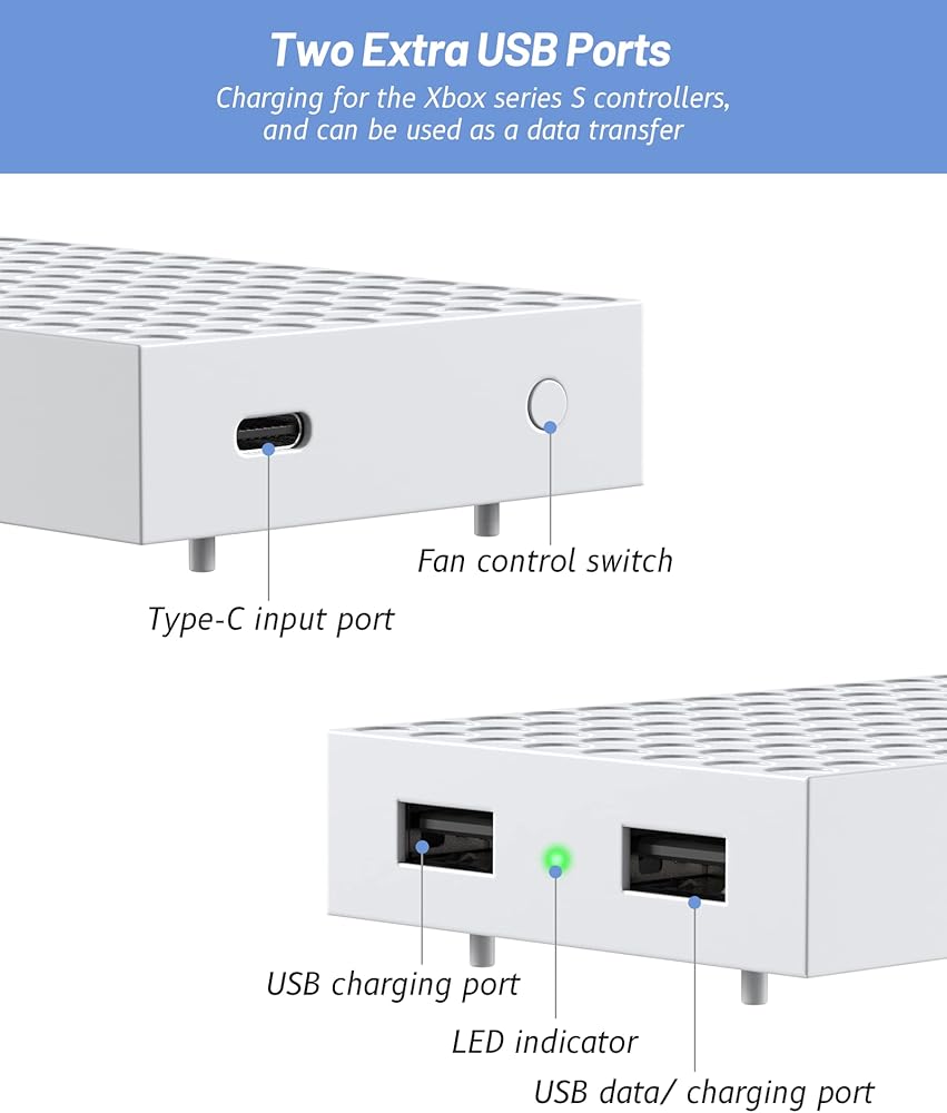 【Thoughtful Detail Design】There are 2 USB ports on this stand with fan. An USB port for charging controller, headset, mouse, smart phone or other electronic device. The other USB port for fast data transfer, uploading or downloading game data. And on the bottom of Xbox Series S cooling stand is designed with non-slip silicone pad, this Xbox Series S cooling stand with fan can prevent your console from falling. With this cooling stand with fan, you can enjoy playing the games without stress.