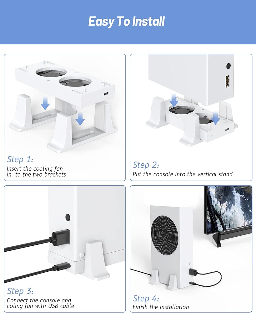 【Easy to Install】Just insert this Xbox Series S cooling stand into the brackets, and install this cooling stand on the top or bottom of the console, connect the console with USB cable. Press the switch and it will start to work. You will get: Xbox Series S cooling stand with fan, charging cable, user manual, our worry-free 24-month warranty, and friendly customer service.