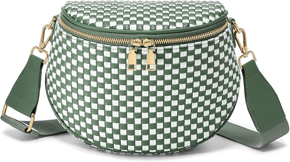 Trendy Woven Checkered Crossbody Bum Bag for Women,PU Leather Checkered Purse Fanny Packs Belt Bag (Woven Bum Bag - Bean Green White)