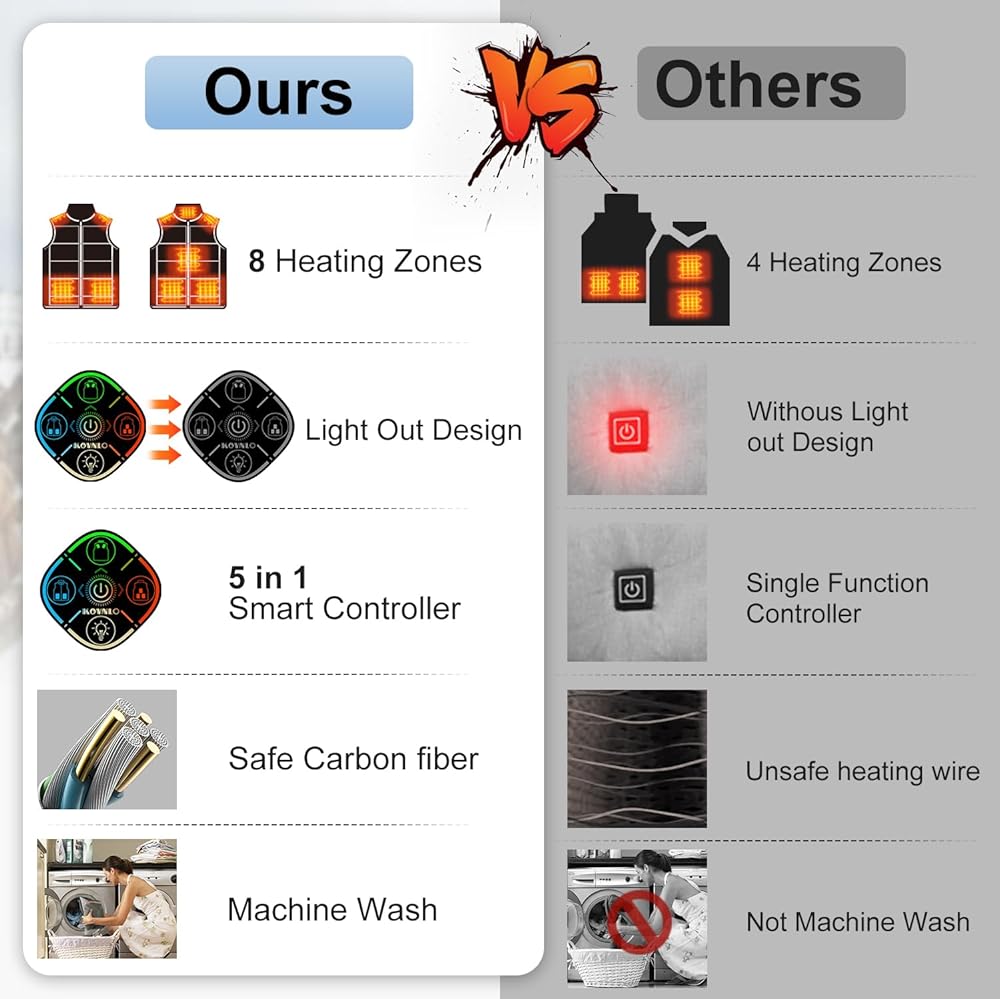 [8 HEATING ZONES – INSTANT WARMTH] :Stay warm instantly with 8 ultra-slim carbon fiber heating elements placed across the neck, shoulders, abdomen (under two pockets), back, and waist. These strategic zones quickly generate even and continuous heat, keeping your core and hands cozy without heavy layers. Experience unprecedented warmth and lightweight comfort—perfect for indoor or outdoor use.