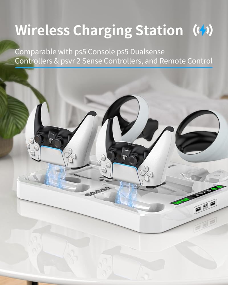 Dual Controller Charge - The charger can simultaneously charge two PS5 controllers and two PSVR2 controllers, with a red light indicating charging and a green light indicating full charge or no load. Charging takes about 3 hours to complete. Additionally, the detachable Type-C connector makes charging more convenient and protects your controller from scratches, increasing its lifespan.