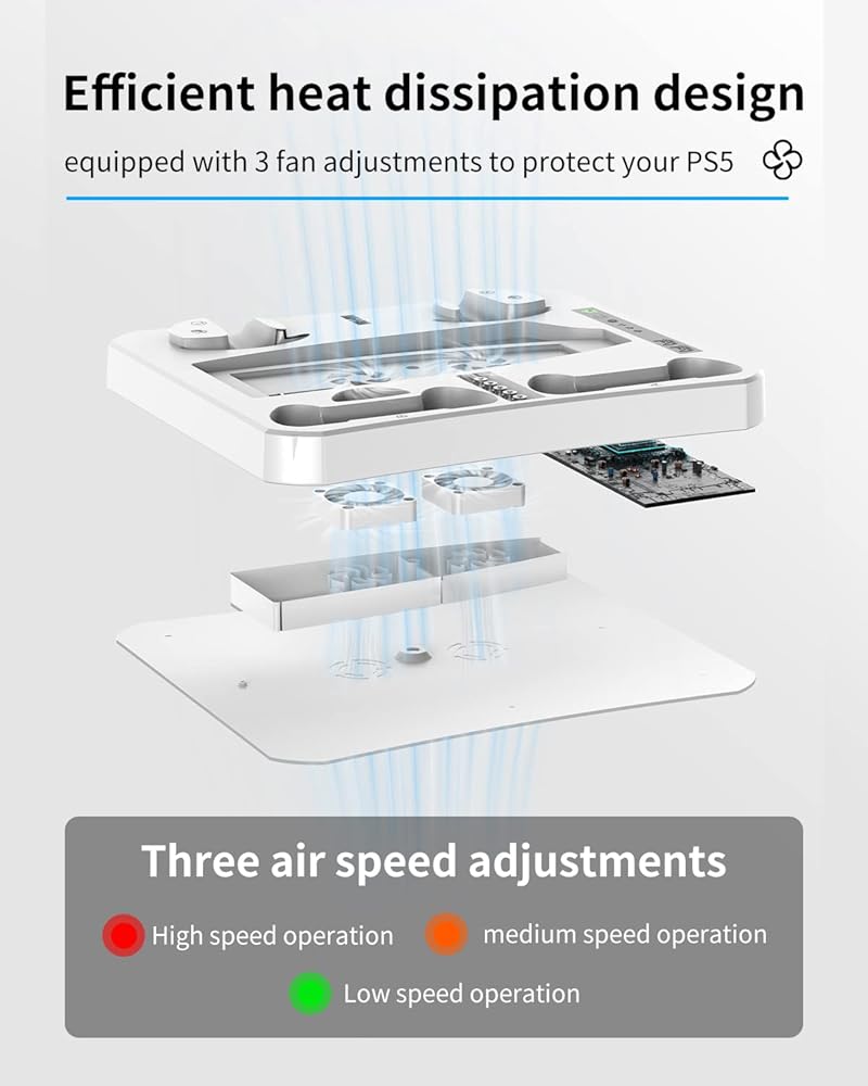 Powerful Cooling System - The PS5 cooling stand is equipped with two high-speed and silent fans that suck hot air from the bottom of the console and effectively dissipate heat in all directions. With three adjustable speeds and a touch switch, the PS5 cooling fan can keep your PS5 console cool without noise, improving your gaming experience and avoiding console overheating due to extended gaming sessions.