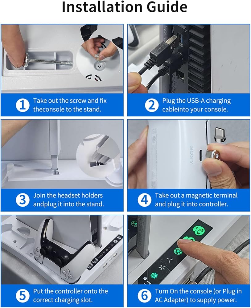 What You Will Get - 1*PS5 Cooling Stand/Controller Charging Station, 1*PSVR2 Glasses Holder, 1*Headset Holder, 5*Magnetic Charging Terminals, 1*Fixing Screw, 2*Magic Straps, 1*USB-A Cable, 1*User Manual, and friendly customer service before and after purchase.