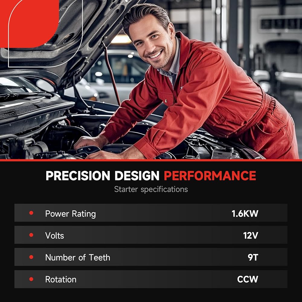 [Reliable Performance] This brand new starter is engineered to meet or exceed OEM specifications. With state-of-the-art manufacturing processes and high-quality materials, this starter promises exceptional durability and reliability. Extensive testing guarantees that this starter can withstand the rigors of daily driving while maintaining peak efficiency. Don't settle for subpar replacements; choose a starter that is built to last and designed specifically for your vehicle's engine specifications.