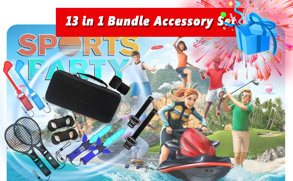【What's in the 13-in-1 set?】The 13in1 Accessories for Switch Sports Game Kit includes mini accessories for a variety of sports games: 2 x tennis rackets, 2 x golf clubs, 1 x wrist strap, 1 x soccer leg strap, 2 x Joy-con cases, 2 x sword grips, 2 x wrist guards, and 1 x storage case. A great value for money option, buy it all at once and start your sports season!