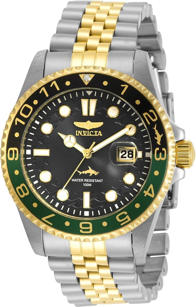 Black dial. Silver-tone stainless steel case with a two-tone (silver-tone and yellow gold-tone) stainless steel band. Quartz movement. 100 meters / 330 feet water resistance. Uni-directional Rotating Coin Edge bezel. Fold Over clasp. Case size 43 mm x 11.5 mm. Invicta 30625 Pro Diver Watch.