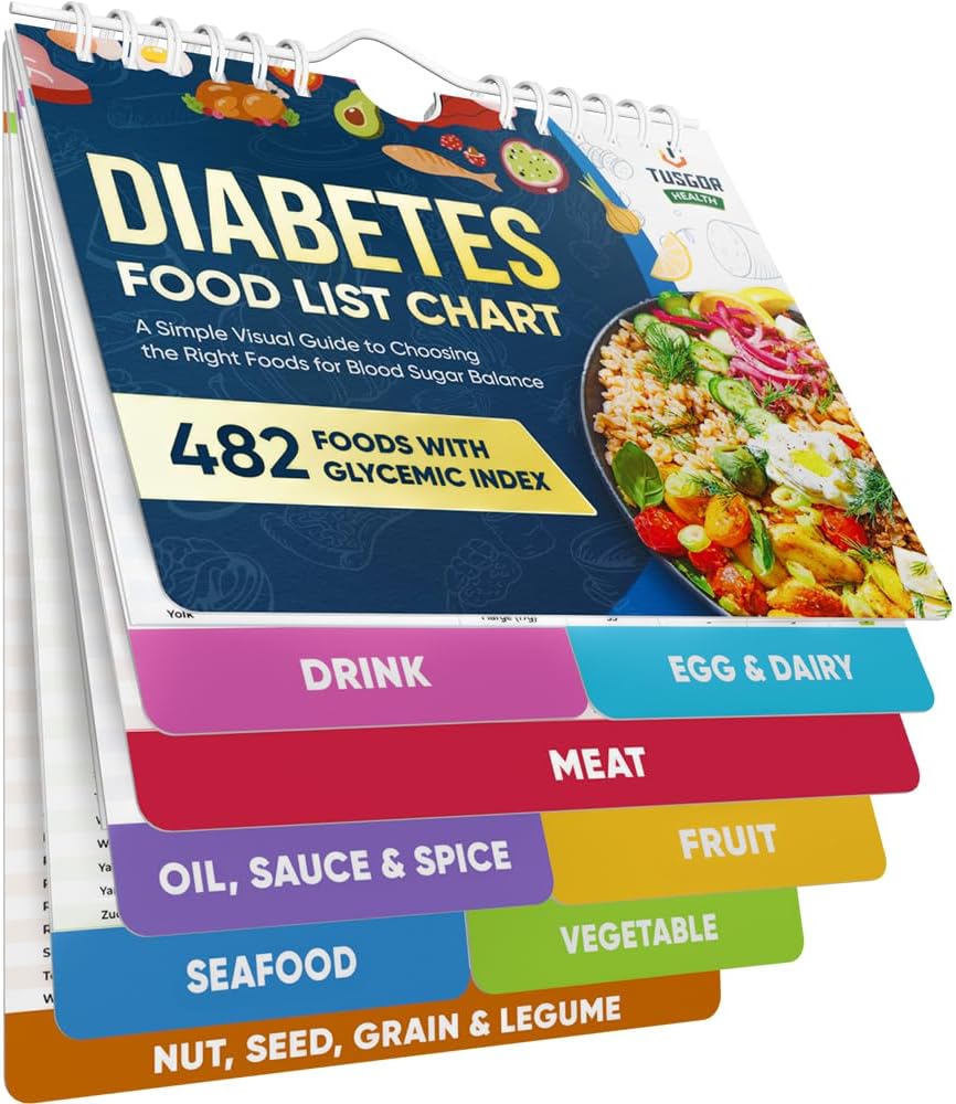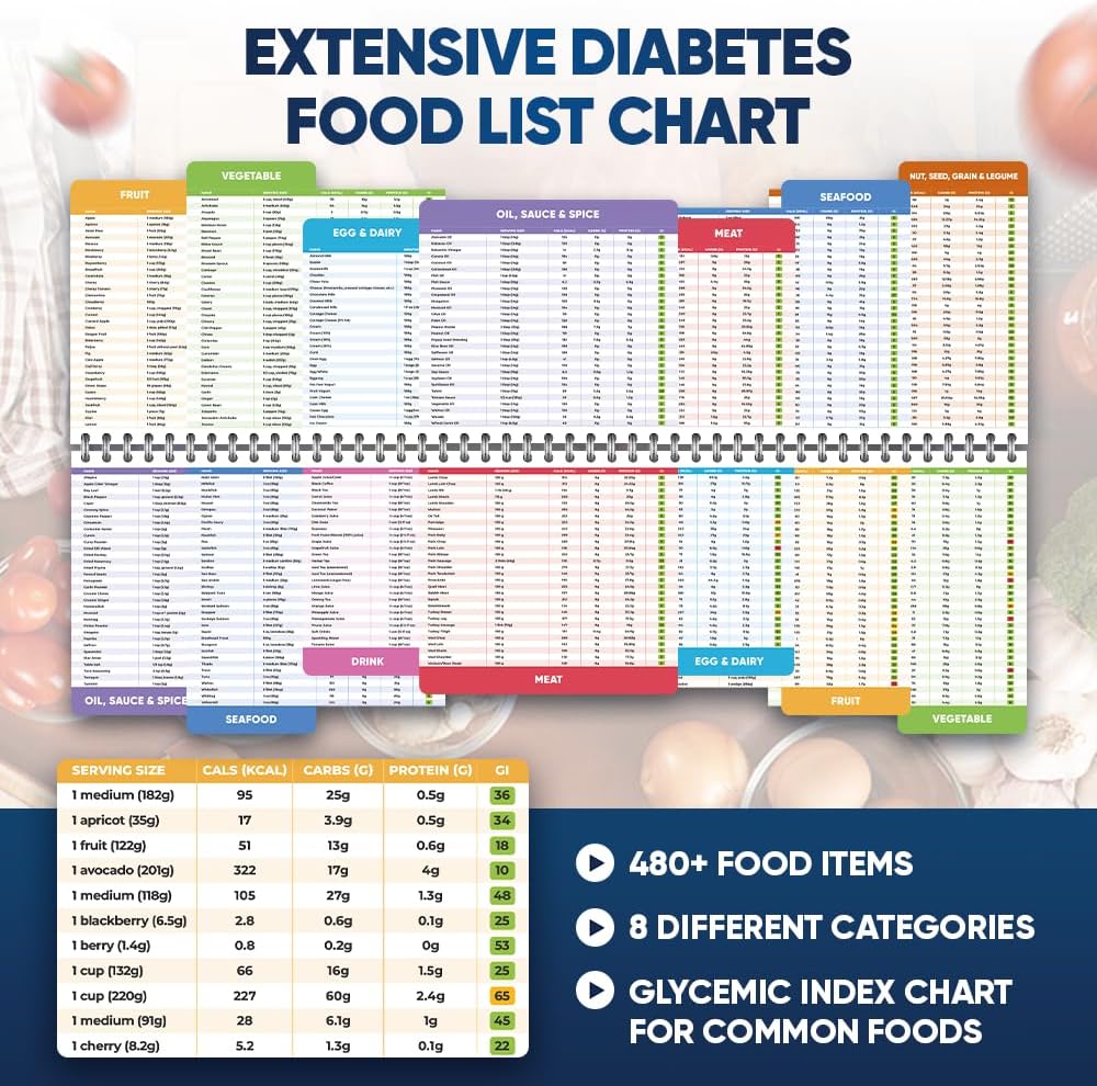 Over 480 Foods with Full Nutrition and Glycemic Index Information: This comprehensive diabetes food chart booklet includes protein, carbohydrates, calories, serving sizes, and Glycemic Index (GI) for 480+ common foods, giving you all the essential data to plan meals, track carb intake, and maintain better blood sugar control. Perfect for anyone managing Type 1, Type 2, or prediabetes.