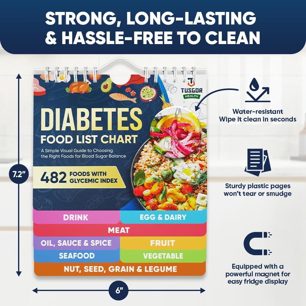 Durable Waterproof Pages – Easy to Clean and Long-Lasting: Made with waterproof, wipeable pages, this magnetic diabetes food chart can withstand kitchen splashes, spills, and messy hands. Simply wipe it clean and keep it looking brand new. Designed for frequent, long-term use as your daily companion in managing blood sugar and planning healthy meals.