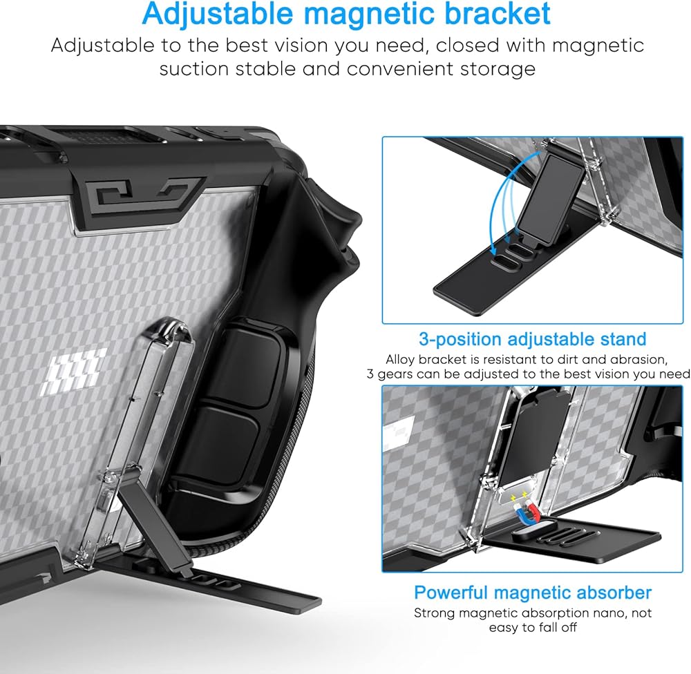 【Magnetic Design & Adjustable Kickstand】Inside of the kickstand comes with powerful magnetic absorption, not easy to fall off. The protective case for Steam Deck built-in adjustable kickstand, made of zinc alloy material, keeps your device more stably. Supports multiple angles to suit your personal preference and comfort while playing, fold up for portability.