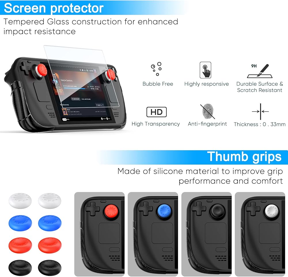 【Upgraded Accessories for Steam Deck】Auarte protective case accessories is specifically designed for Steam Deck(2022 Release). This Accessories bundle for Steam Deck included 1*Protective Case, 1*Tempered Glass Screen Protector [with cleaning kits], 8*Thumb Grip Caps. A valued gift pack of accessories kit for Steam Deck fans.