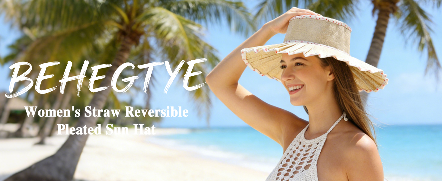 Lorna Murray hat Women's Straw Reversible Pleated Sun Hat, Wide Brim Foldable Casual Outdoor Beach Hat Summer Sun Hat