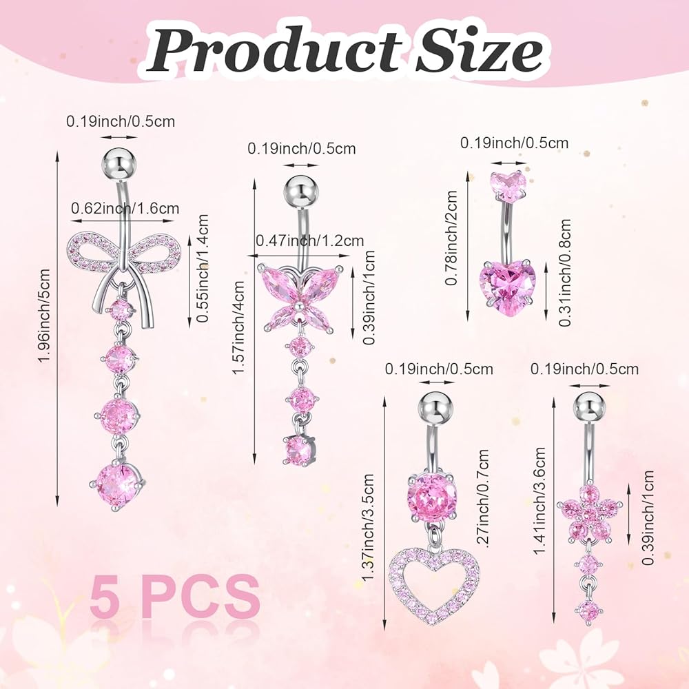 【QUALITY MATERIAL】: Crafted from stainless steel and adorned with pink CZ, these silver dangle belly button rings are anti-sensitive, ensuring safe wear. The pink belly button piercing designs are perfect for sensitive skin, providing a comfortable fit.