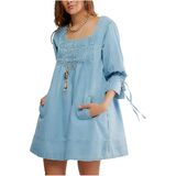The perfect blend of cool and classic, this totally timeless mini dress is featured in a staple chambray fabrication with a square neckline, slightly puffed long sleeves, and defined detailing at bust for a dimensional finish. **Fit:** Relaxed, babydoll-inspired fit **Features:** Square neckline, defined long sleeves, pull-on style, side pockets, tie detailing at sleeve cuffs **Why We ❤ It:** The perfect piece to pair with anything from high boots to cool sneakers or slides, this super versatile mini dress is designed to take you from season to season.