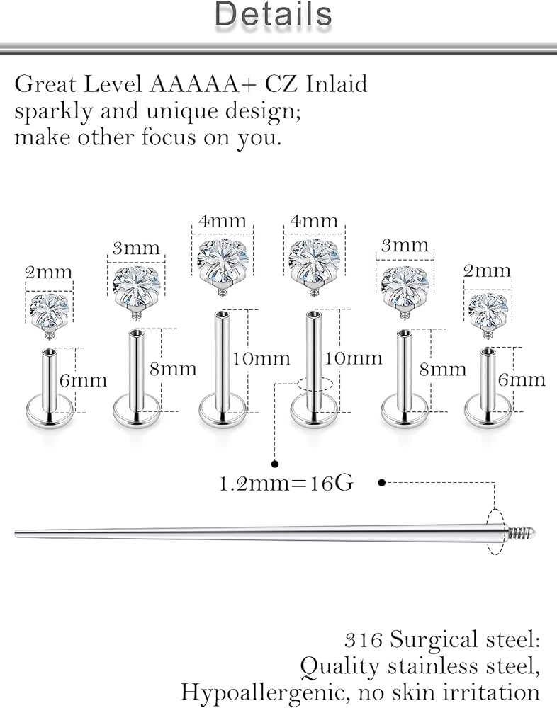 MEASUREMENTS--Lip Rings Studs Gauge Size: 14G (1.6mm); Straight Bar Length: 6mm(1/4 Inch), 8mm(5/16 Inch), 10mm(3/8 Inch), CZ Top Size:2mm 3mm 4mm, The Different Sizes Made It Easy to Find the Right One for You. Color: Silver/Black-tone.