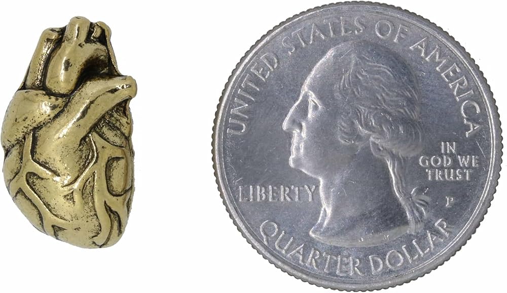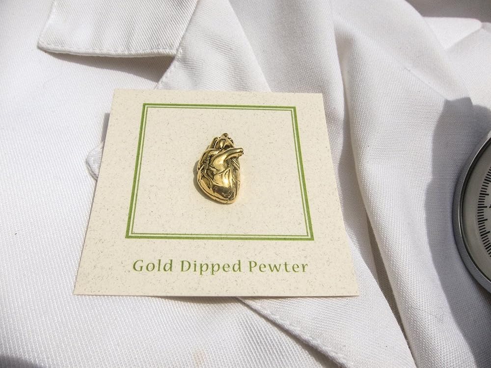 The heart is actually located almost in the center of the chest, between the lungs. It's tipped slightly so that a part of it sticks out and taps against the left side of the chest, which is what makes it seem as though it is located there. Handcast in solid, lead-free pewter and then dipped in gold, each of our pins is an original three dimensional sculpture signed by the artist, Jim Clift. Individually packaged on one of our signature presentation cards, our pins arrive ready for gift giving! Handcrafted in our studio in Coventry, RI, our pins are 100% US made.