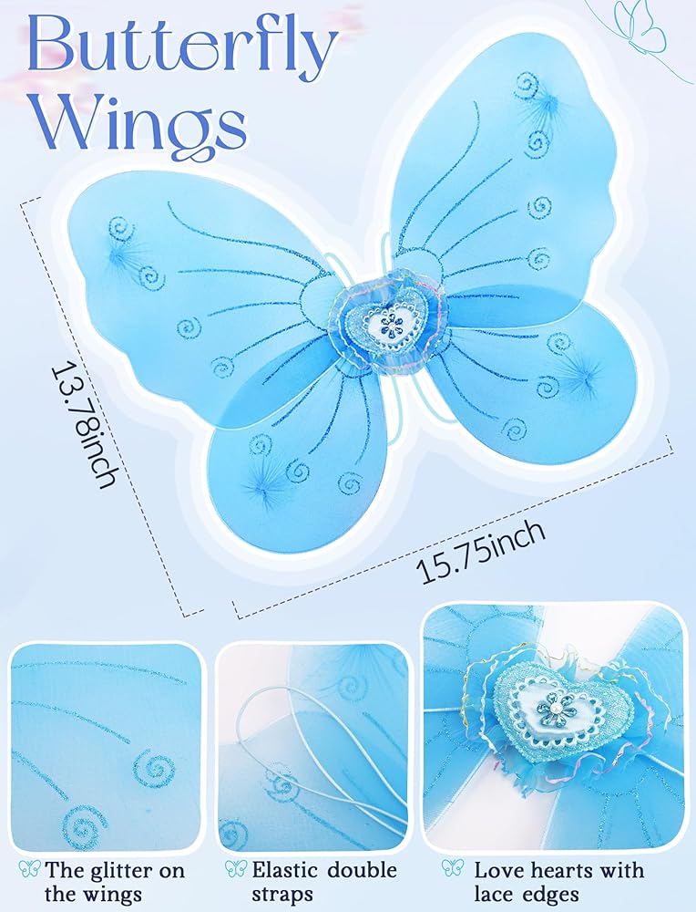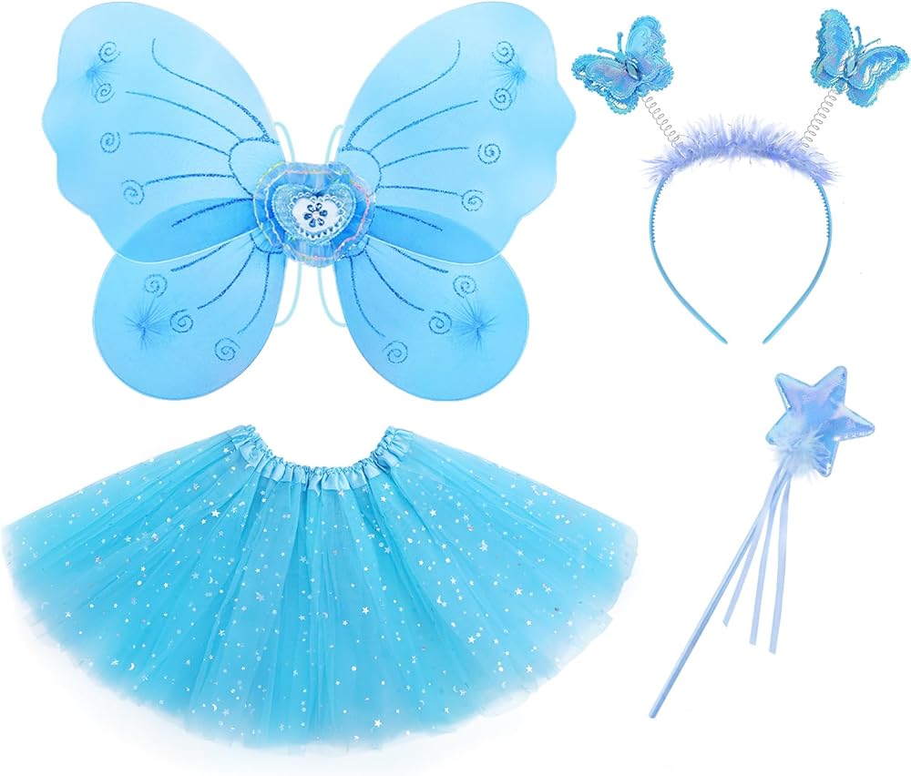 Package Included 4pcs: Each toddler dress up clothes set includes 1x tutu skirt, 1 x fairy wing, 1x headband, 1 x wand.Available in pink, blue, purple, and rainbow to suit every child's preference.Butterfly costume for girls perfect for imaginative play, this fairy costume set includes everything your little one needs to transform into a sparkling fairy.