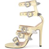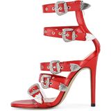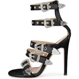 - Round open toe, buckles, zip up, metal decorations, thin high heels, ankle high sandals
