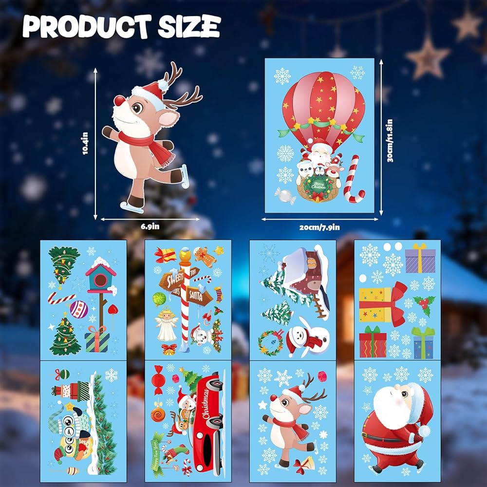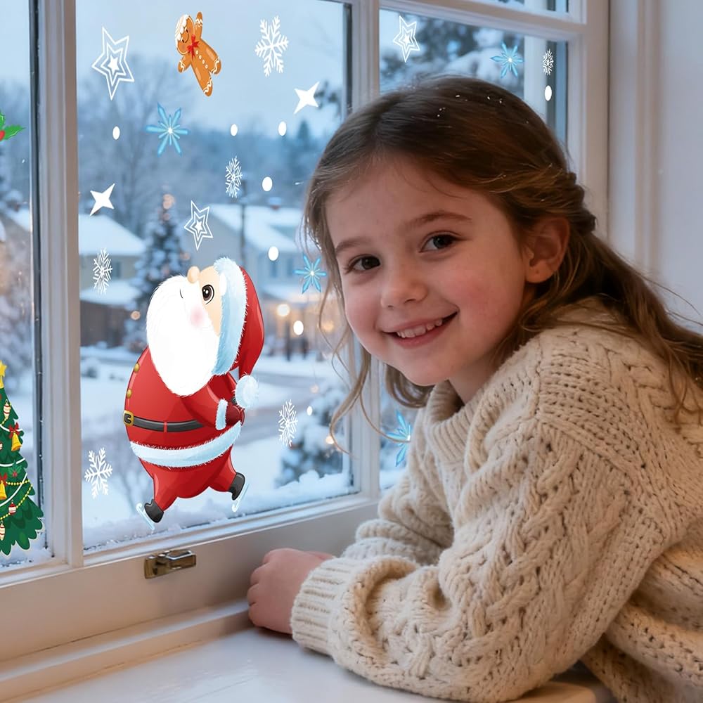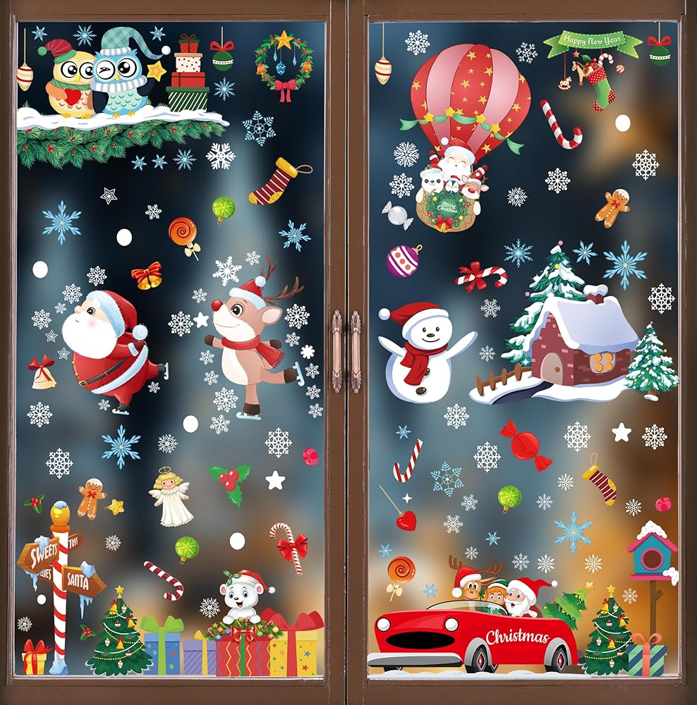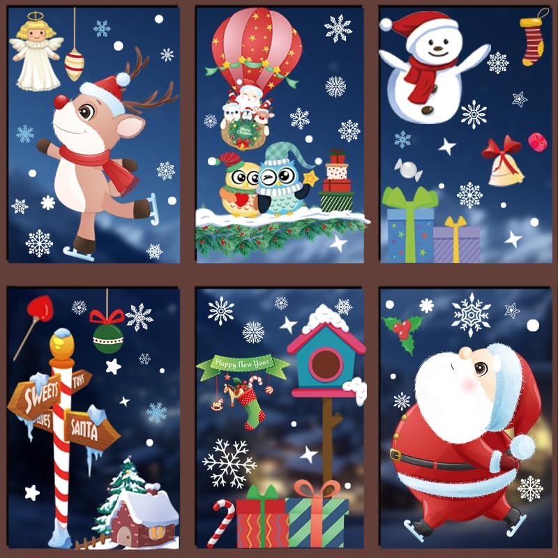 120Pcs Christmas Window Clings Stickers, 9 Sheets Snowflakes Merry Window Decorations with Cute Santa Reindeer Snowflake Patterns for Holiday Decor Home Xmas Party Indoor