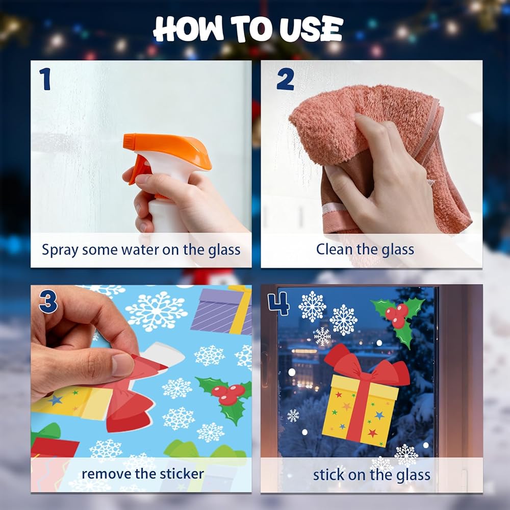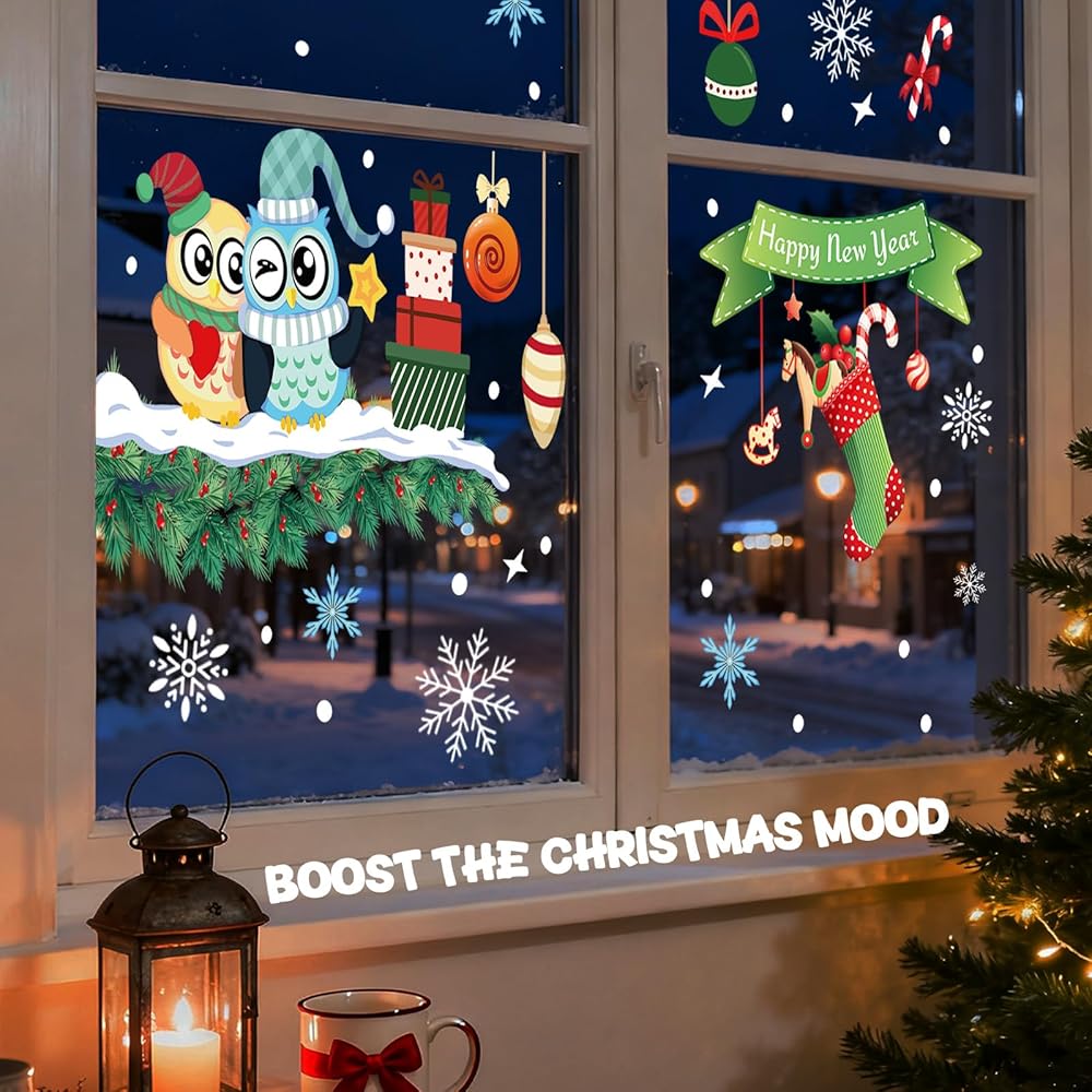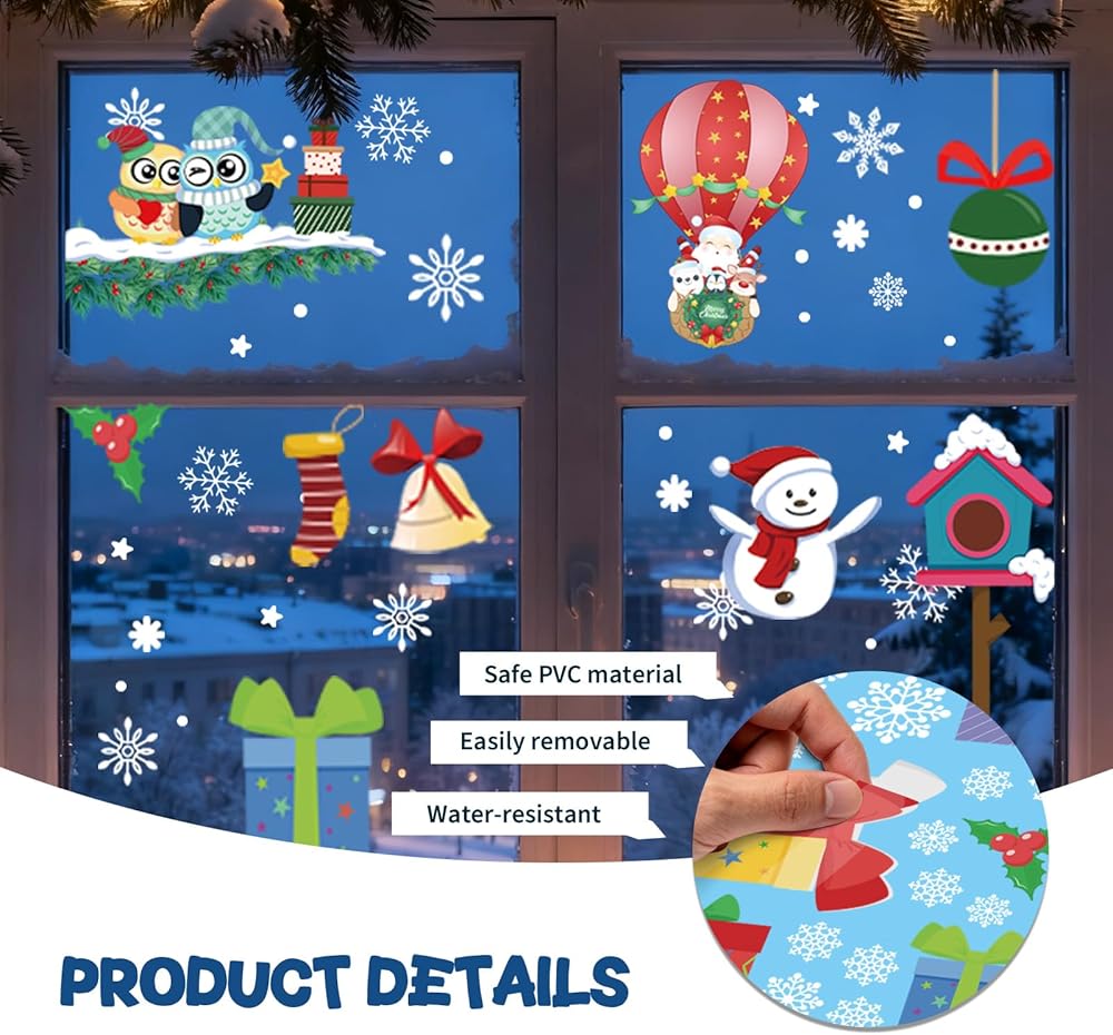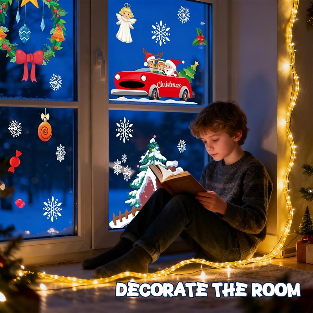 120Pcs Christmas Window Clings Stickers, 9 Sheets Snowflakes Merry Window Decorations with Cute Santa Reindeer Snowflake Patterns for Holiday Decor Home Xmas Party Indoor