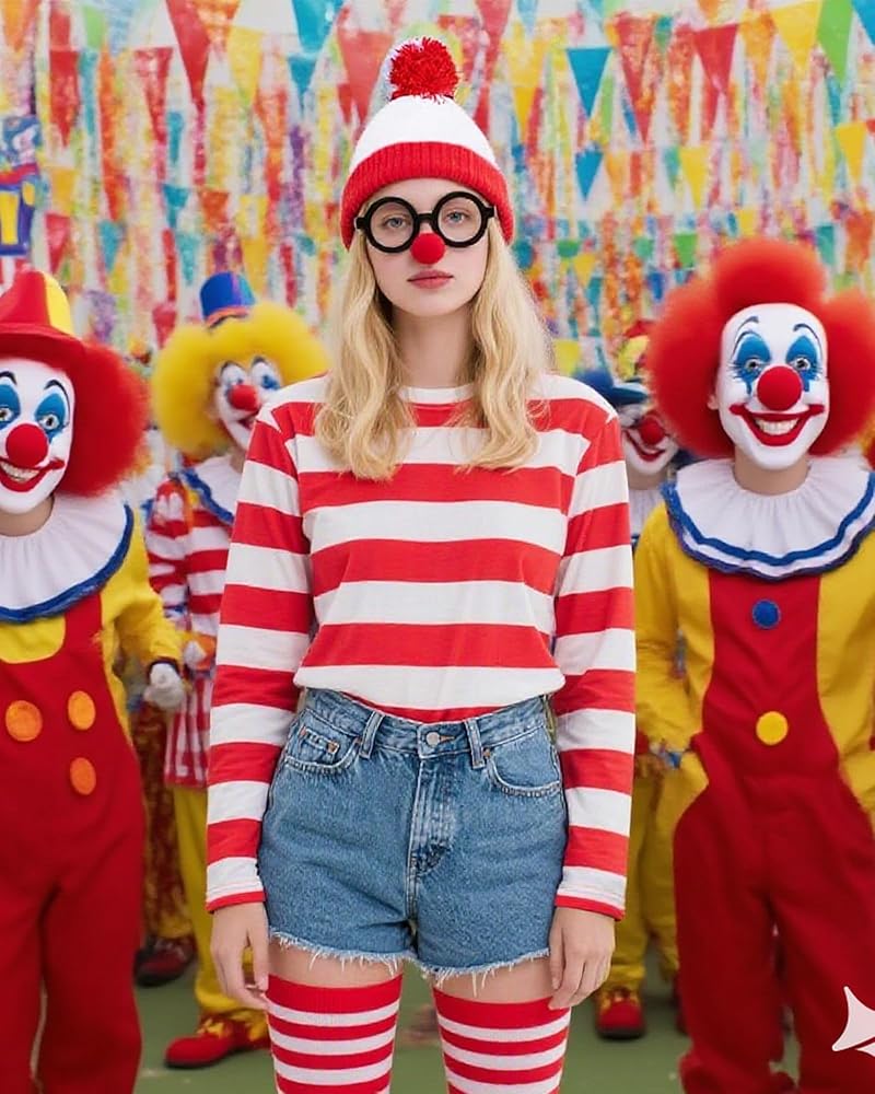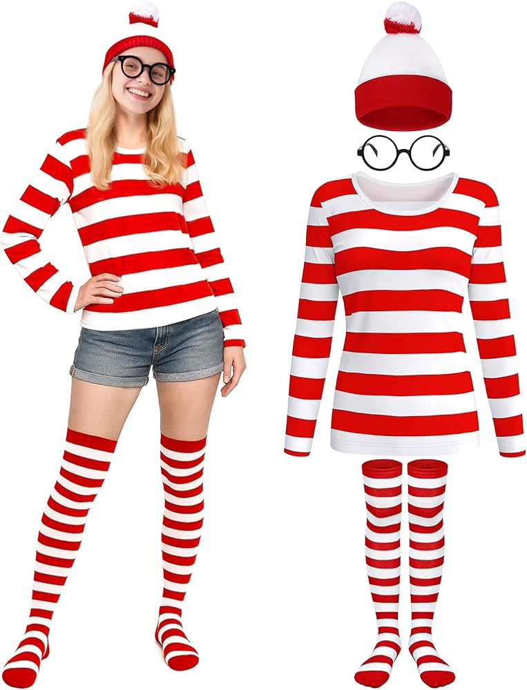 Package Includes: This halloween costume set includes 1 red and white striped shirt, 1 beanie cap, 1 pair of socks, and 1 pair of glasses