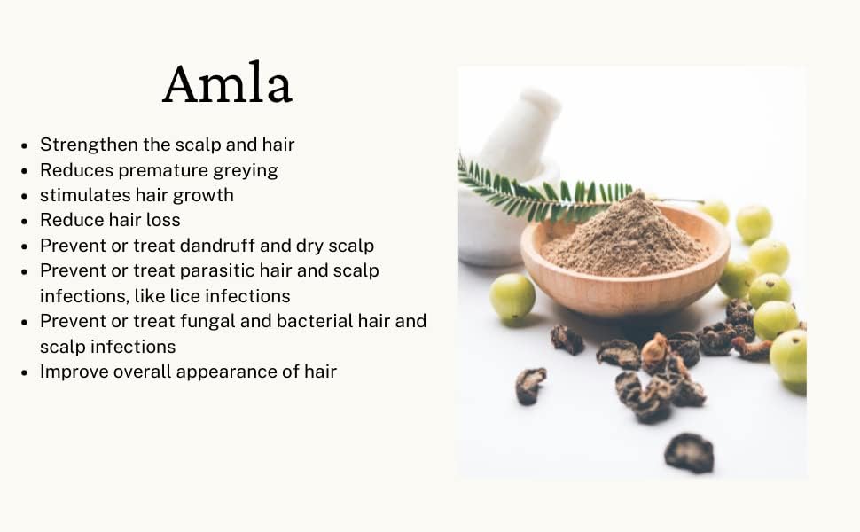 - Amla-Strengthen the scalp and hair Reduces premature greying. Stimulates hair growth. Reduce hair loss. Prevents dandruff.