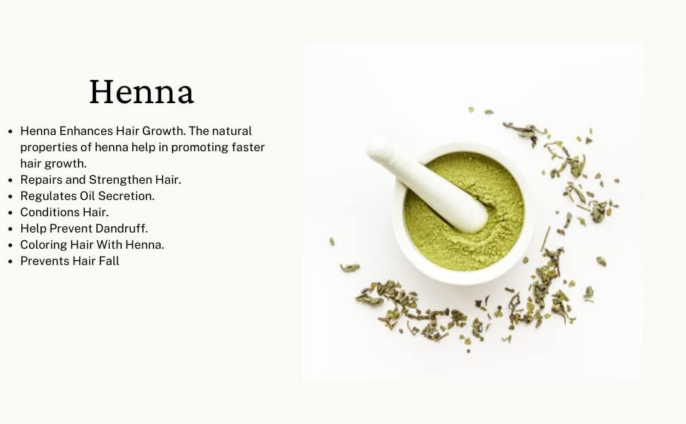 - Henna- Enhances Hair Growth. Repairs and Strengthen Hair. Conditions Hair. Prevent Dandruff. Prevents Hair Fall