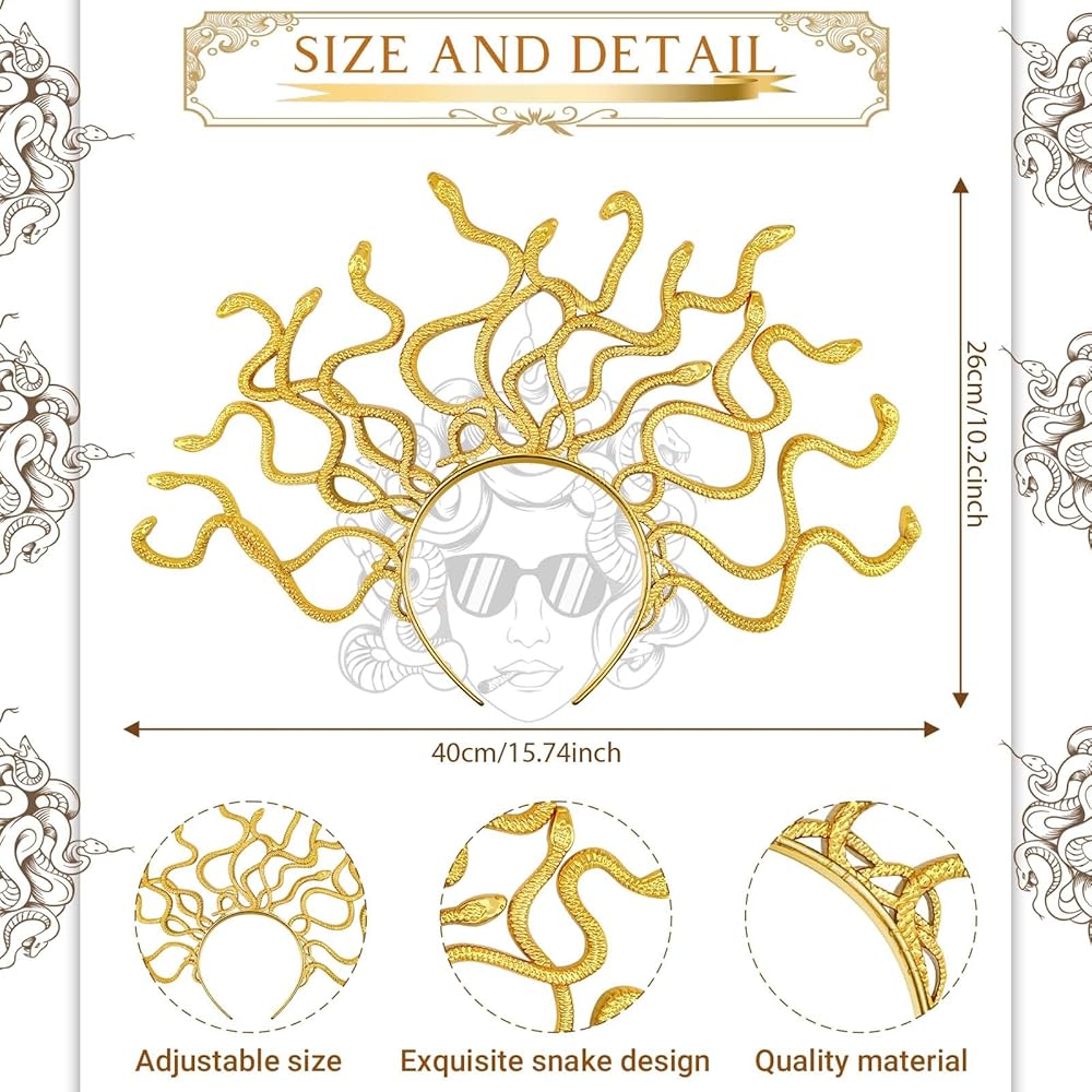 【Package Include】You will receive 1 golden snake headband, 1 pair of snake-shaped earrings, 1 snake bracelet, 1 snake necklace,1 green eye-shadow and 1 scale template,complete for your medusa cosplay.