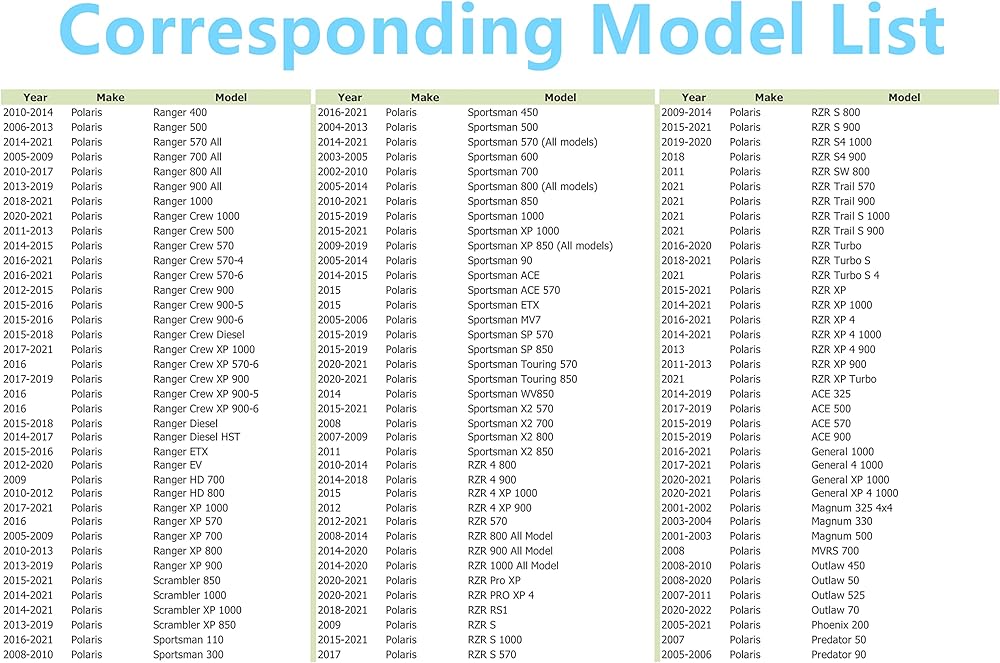 Fits Polaris 2010-14 Ranger 400; 2006-13 Ranger 500; 2014-19 Ranger 570 (All); 2005-09 Ranger 700 (All); 2010-14 Ranger 800 (All) 2013-19 Ranger 900 (All); 2018-19 Ranger 1000; 2015-16 Ranger ETX; 2012-20 Ranger EV; 2016-19 General 1000