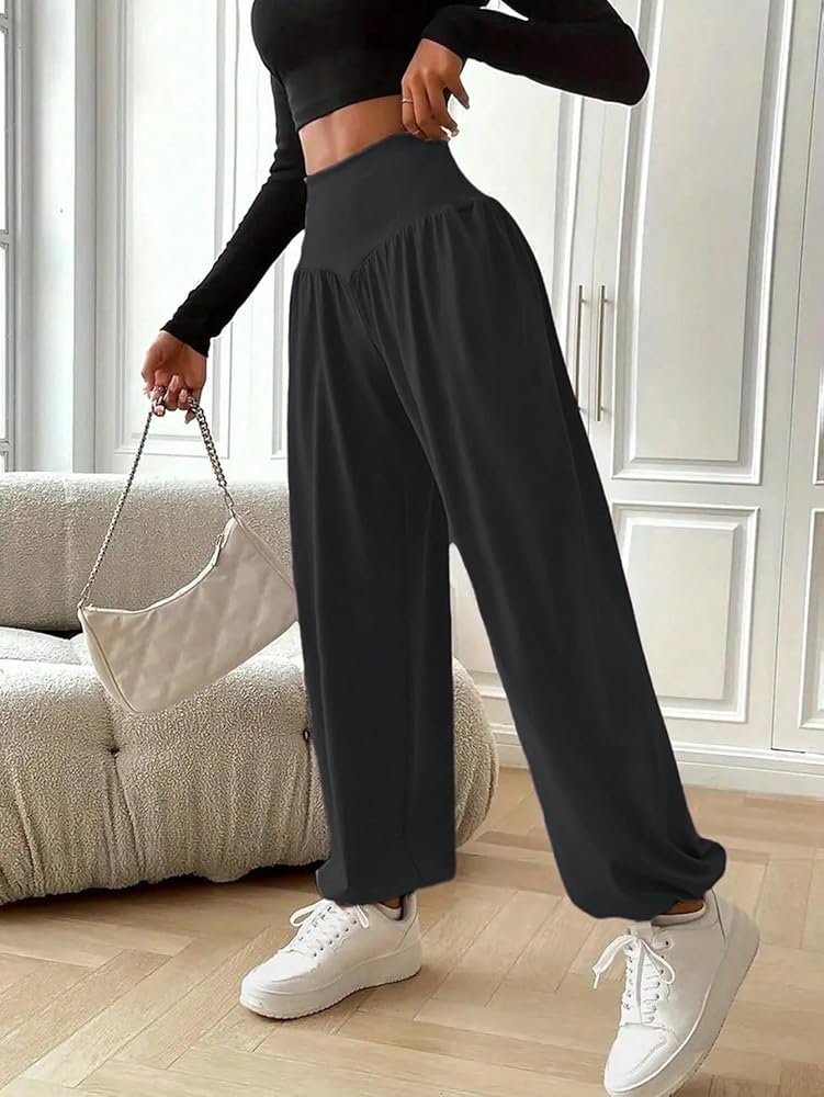 ULTIMATE COMFORT:Experience all-day comfort with our harem pants, designed with a high waist and elastic band. Made from a soft blend of Polyester andSpandex, they offer a lightweight feel that moves with you effortlessly.