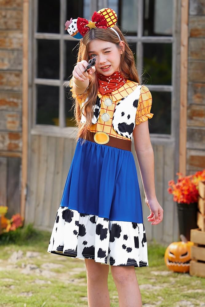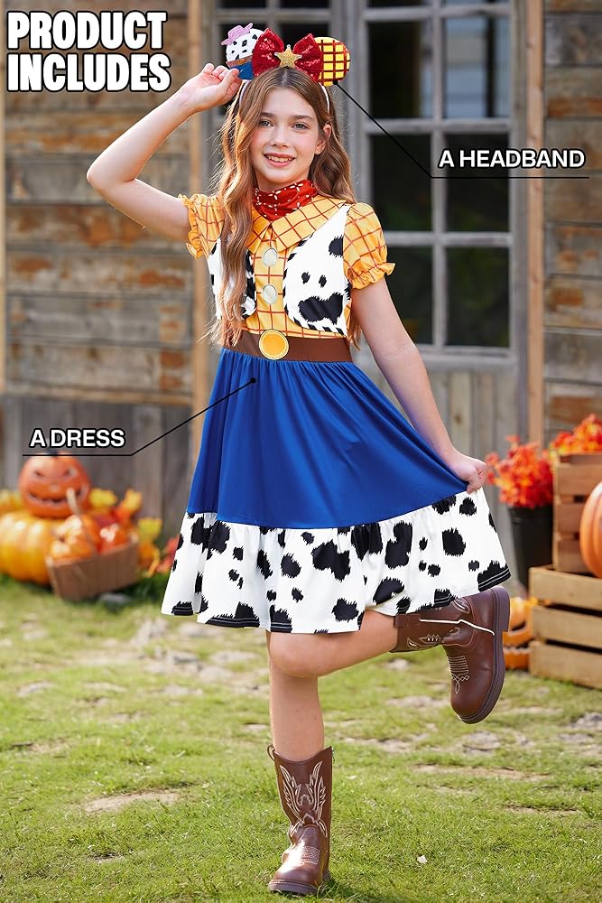 Complete Cowgirl Outfit – Includes a layered blue and cow print dress with puff sleeves and a matching Mouse Ear Headbands for a charming western look.