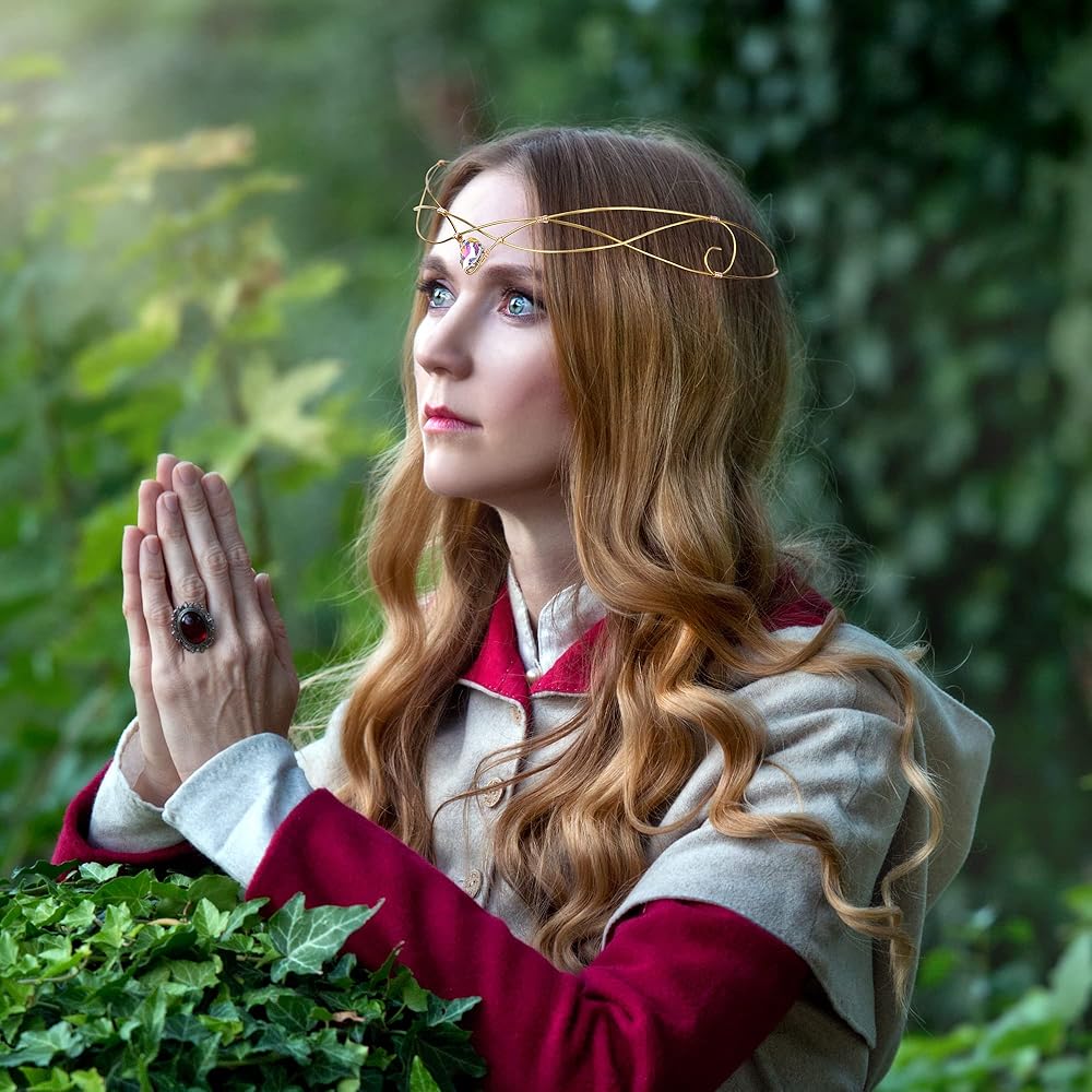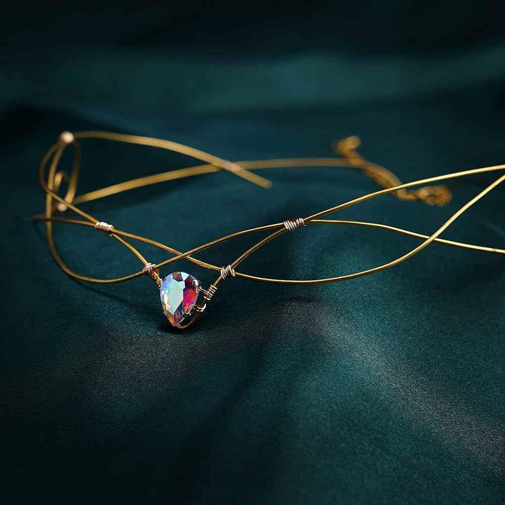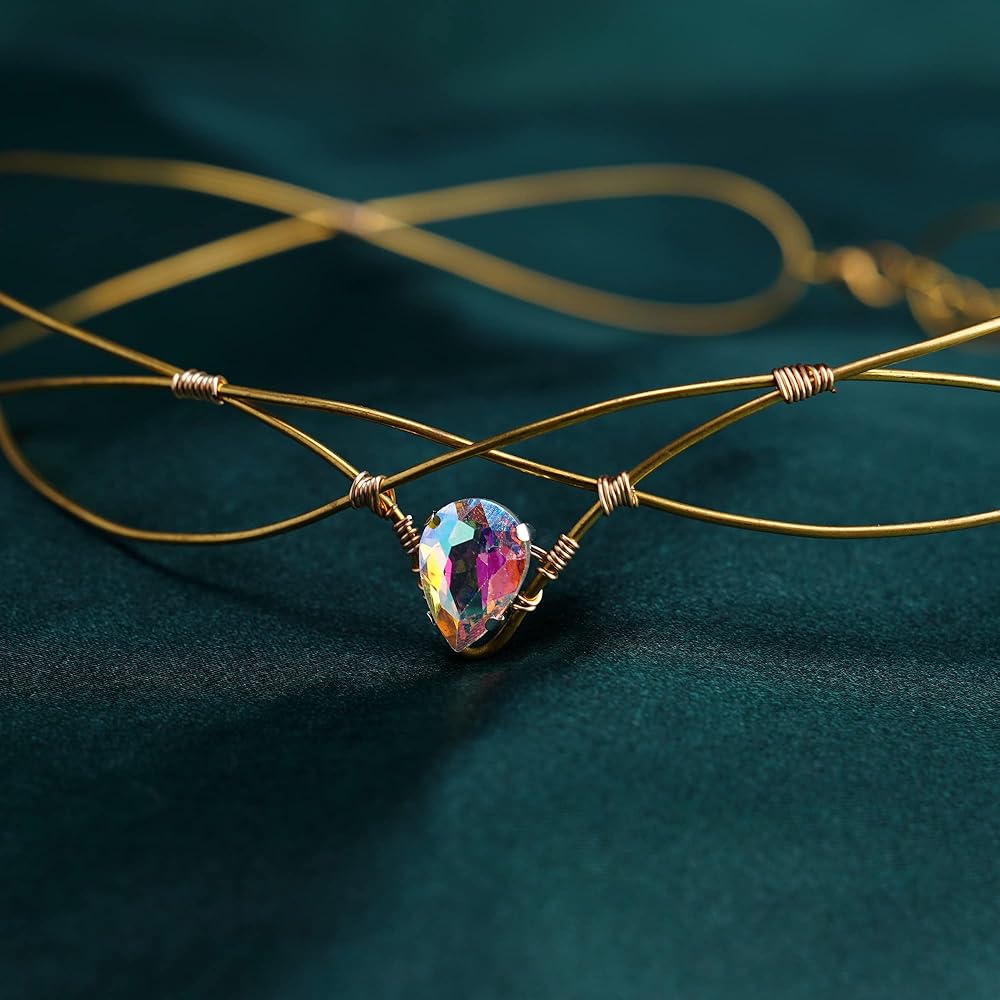 Fairy Circlet Princess Tiara Rhinestone Handmade Gold and Green Headband Vintage Wedding Costume Headpiece Elf Crystal Crown for Renaissance Cosplay Halloween Festival Party Birthday