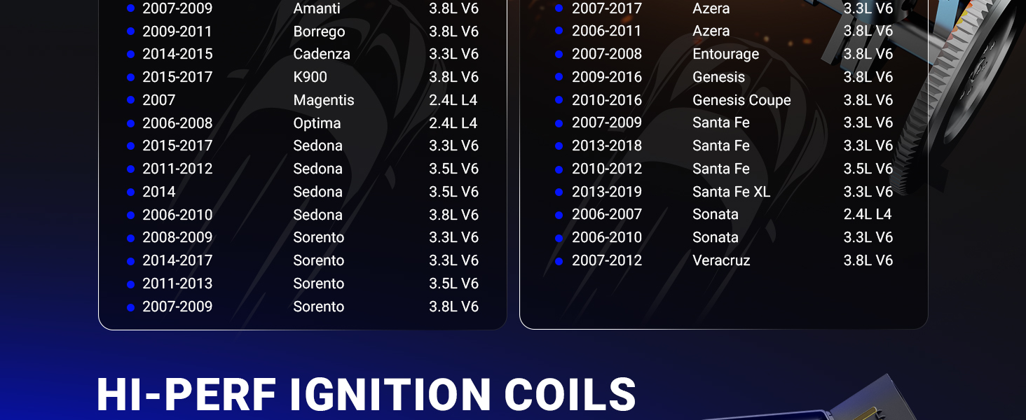 ✔Compatible with: For Hyundai: 07-17 Azera 3.3L V6丨06-11 Azera 3.8L V6丨07-08 Entourage 3.8L V6丨09-16 Genesis 3.8L V6丨10-16 Genesis Coupe 3.8L V6丨07-09 Santa Fe 3.3L V6丨13-18 Santa Fe 3.3L V6丨10-12 Santa Fe 3.5L V6丨13-19 Santa Fe XL 3.3L V6丨06-07 Sonata 2.4L I4丨06-10 Sonata 3.3L V6丨07-12 Veracruz 3.8L V6. For Kia: 07-09 Amanti 3.8L V6丨09-11 Borrego 3.8L V6丨14-15 Cadenza 3.3L V6丨15-17 K900 3.8L V6丨07 Magentis 2.4L I4丨06-08 Optima 2.4L I4丨15-17 Sedona 3.3L V6丨11-12 Sedona 3.5L V6丨14 Kia Sedona 3.5L V6丨06-10 Sedona 3.5L V6丨08-09 Sorento 3.3L V6丨14-17 Sorento 3.3L V6丨11-13 Sorento 3.5L V6丨07-09 Sorento 3.8L V6. Please see the second main picture for more vehicles before purchase.