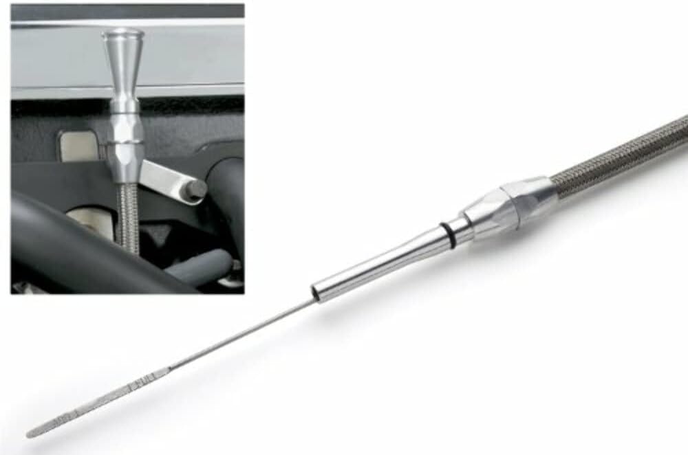 Lokar Flexible Engine Dipstick 4.6 Modular is a Billet aluminum and stainless Dipstick for the pre-1980 Small Block Chevy. The application is straight into the engine block - no upper tube necessary. The dipstick seals at bottom of the handle with double O-rings. The Billet aluminum handle has been designed to coordinate with the Lokar Flexible Transmission Dipstick.