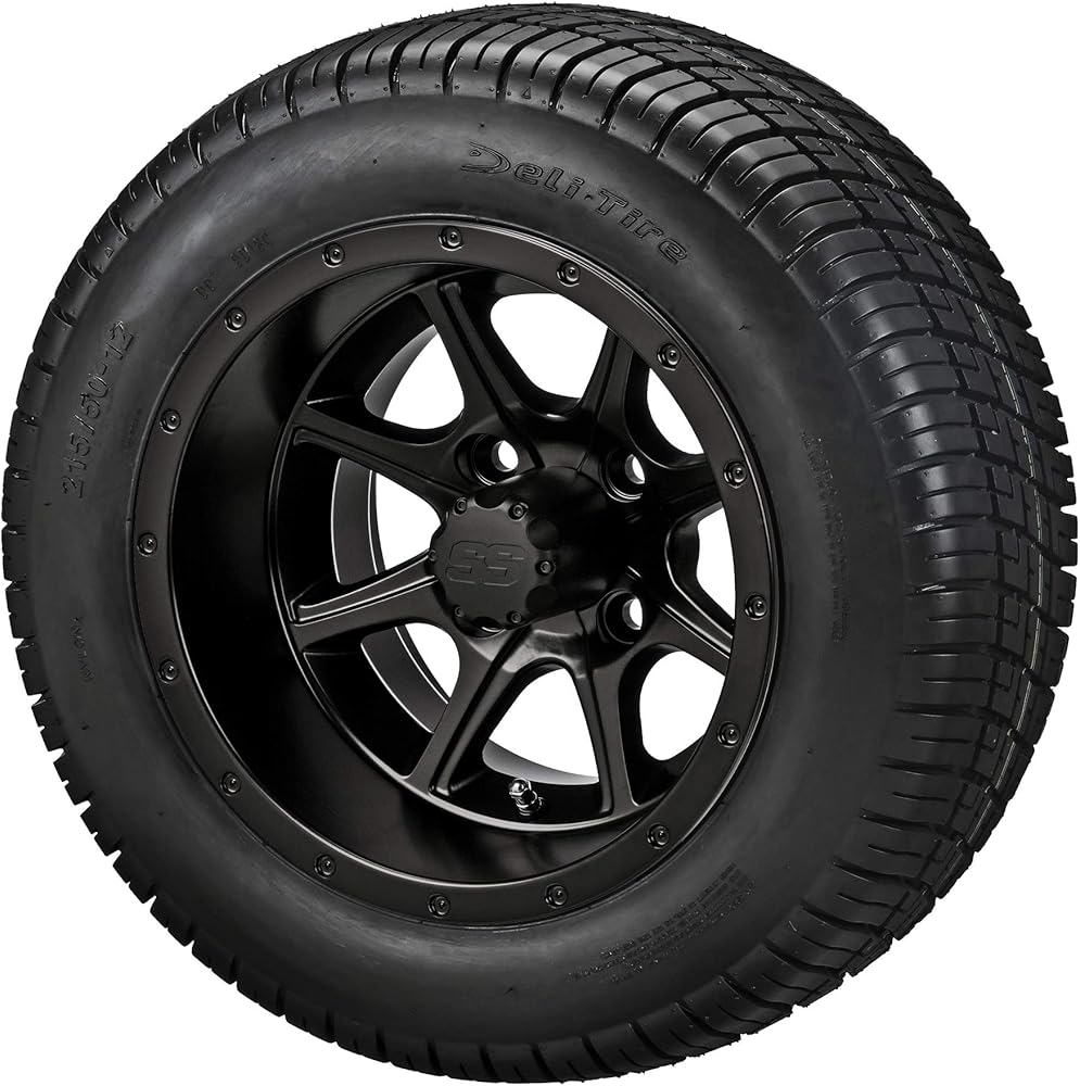 Set of four (4) 12" Azusa Matte Black wheels, four (4) 215/50-12 Deli tires, four (4) SS wheel caps, and sixteen (16) metric lug nuts. Tires are pre-mounted on wheels before shipping.