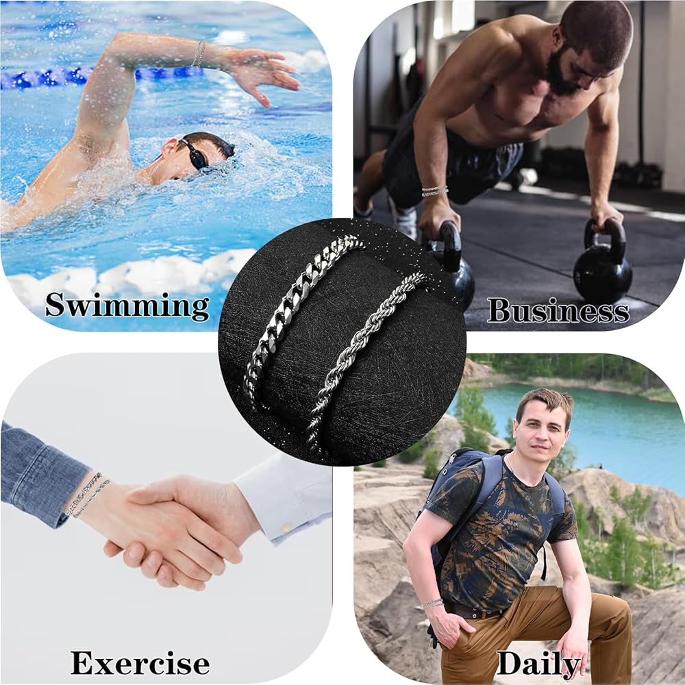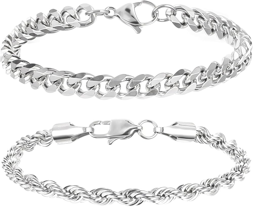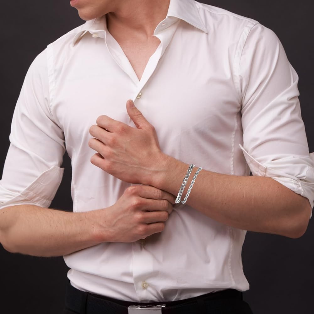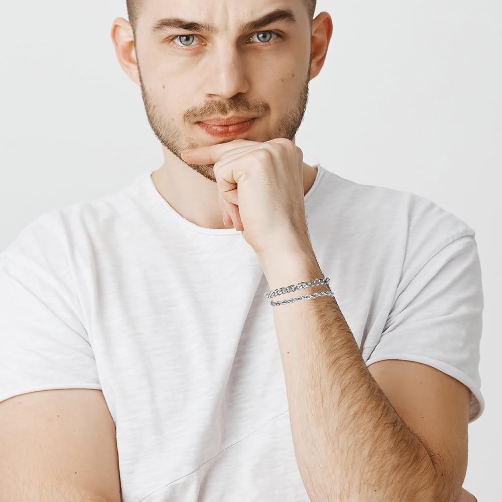 • Exquisite Design: The two silver chain bracelets for men in the pack feature a twist chain and a six-sided link chain respectively, which are classic and elegant, adding a sense of fashion to the basic look.