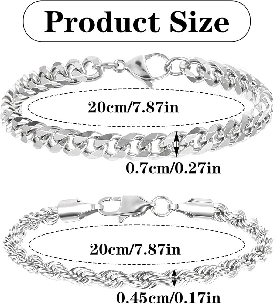• Suitable Size: The size of the twisted chain in the stainless steel bracelets for men is 20*0.45 cm/7.87*0.17 in, and the size of the six-sided grinding chain is 20*0.7 cm/7.87*0.27 in, which is suitable for both men's and women's wrist sizes.