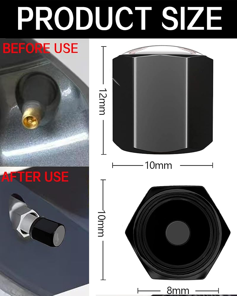 • Universal Fit: Designed to fit most cars, SUVs, trucks, bikes, motorcycles, and bicycles with standard valve stems (Inner Diameter: 7-8mm, Height: 12-14mm).