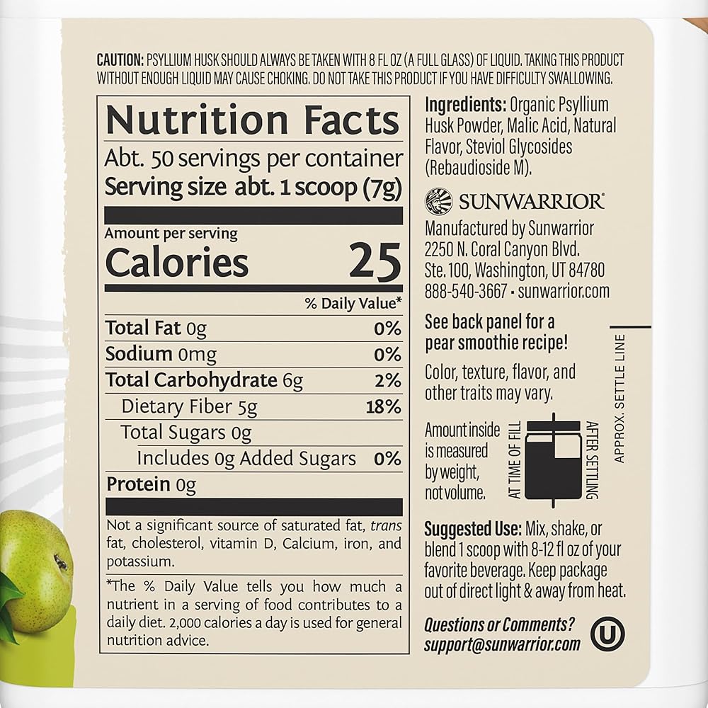 Sunwarrior Organic Psyllium Husk Powder Plant-Based Fiber for Gut Health & Regularity, Supports Digestion & Satiety, Certified Organic, Gluten-Free, Non-GMO, Keto-Friendly 50 Servings, Pear Flavored