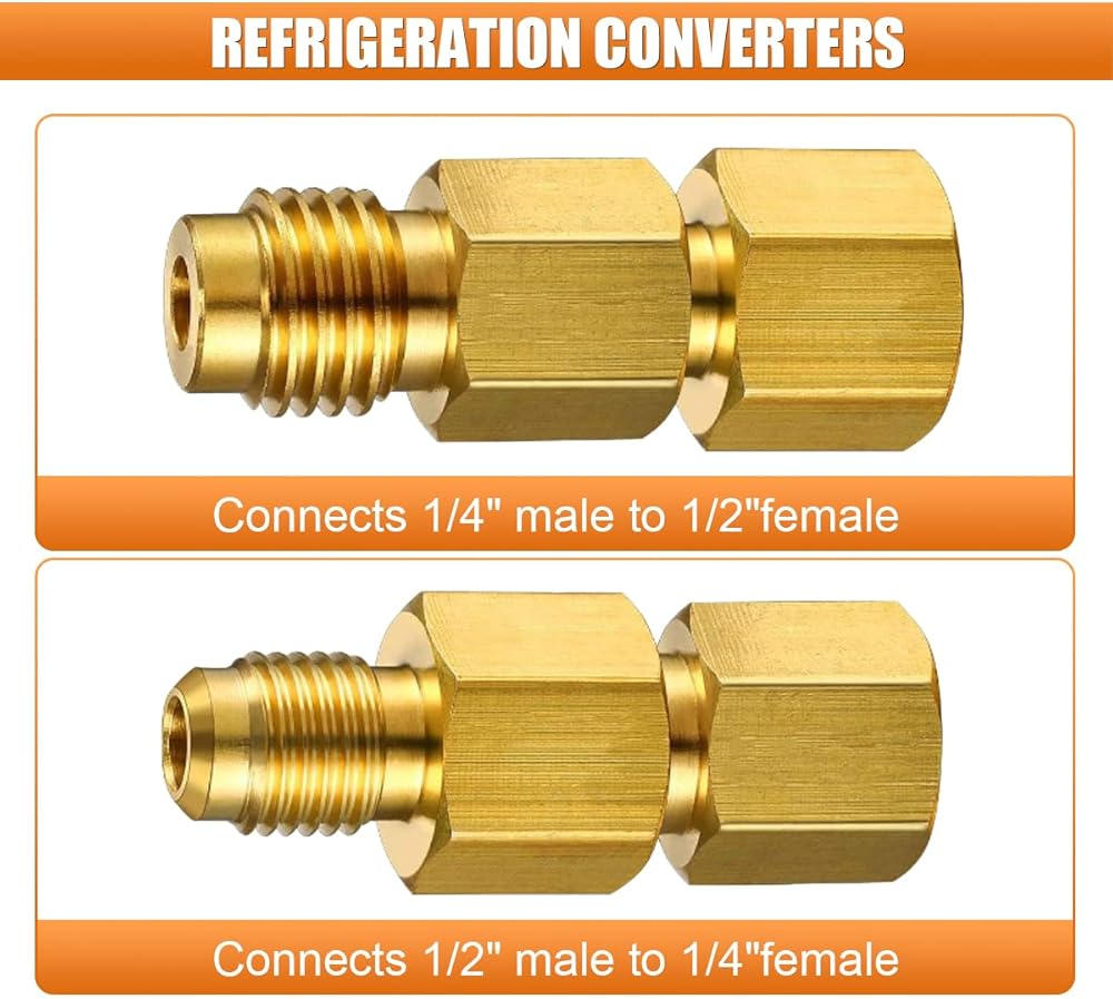 【Connections】:This vacuum pump adapter is equipped with two standard interface specifications: 1/4-inch SAE female × 1/2-inch male and 1/2-inch female × 1/4-inch SAE male, ensuring precise matching with equipment and more reliable connections.